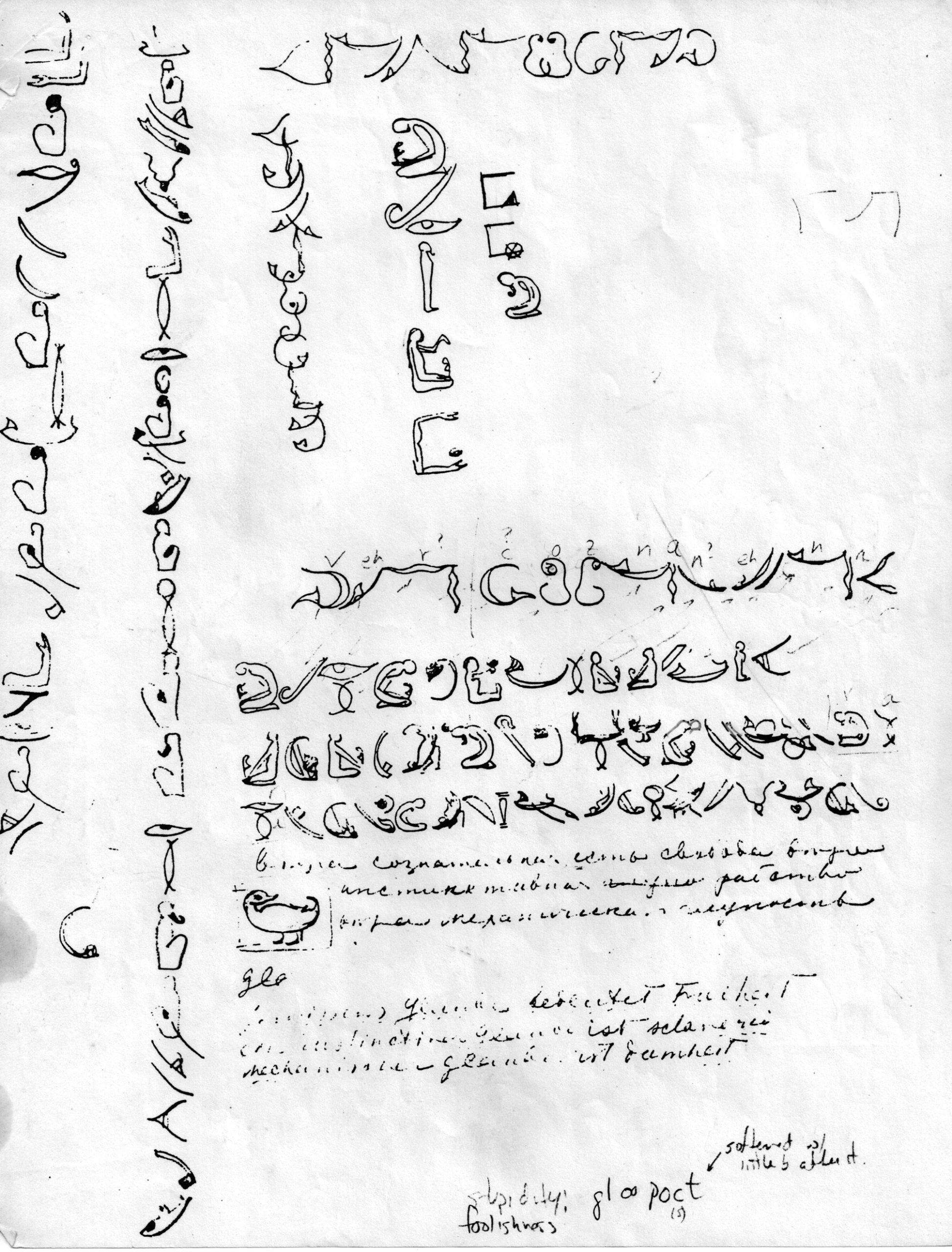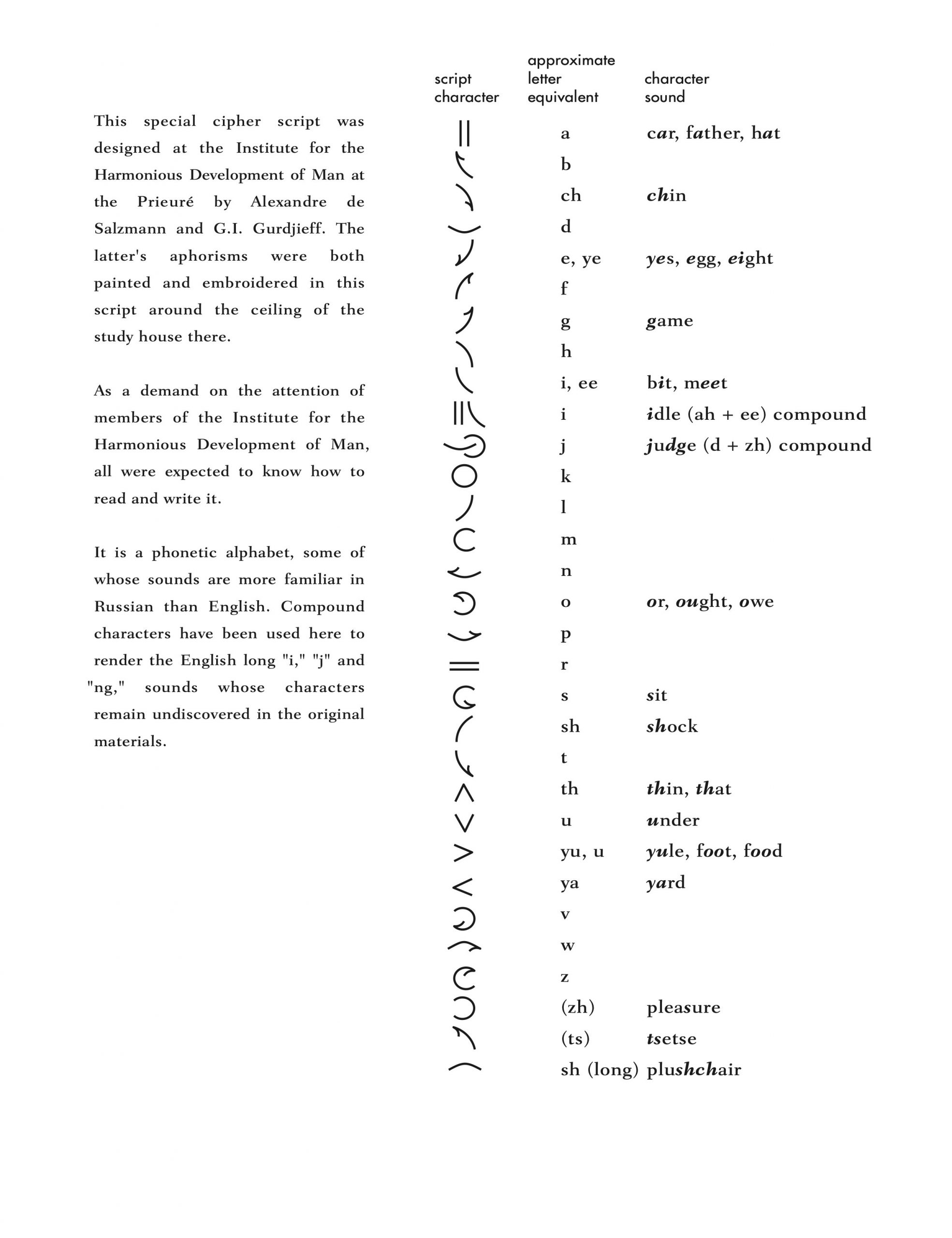 At that time the only examples of the script we could find were jacket of Views From the Real World, and one page in a J.G. Bennett book, Gurdjieff: Making a New World. Most of the “characters” and sounds were included in that Bennett book. The description of the phonetic nature of the alphabet made it possible to write in any language. Dushka Howarth, who had grown up at the Prieuré, provided more insight into the script. It was like a secret code children sometimes use. But this was for Prieuré residents, placing a demand on their attention. Everyone was expected to be able to read and write it, and if one did not, he might, for instance, miss dinner.
