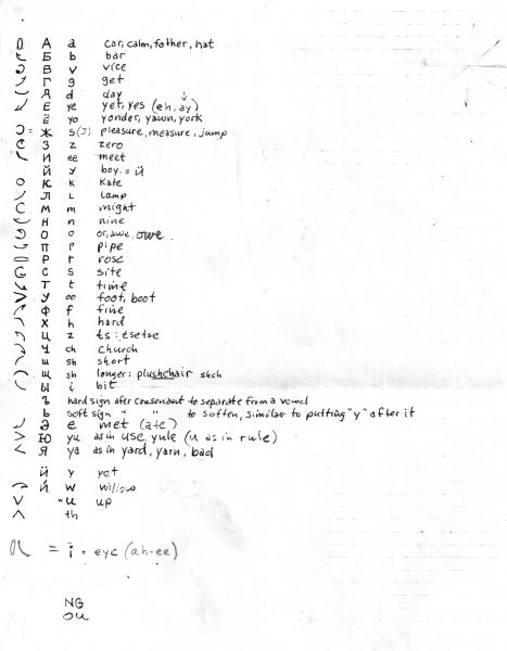 Thus, as it is based on Russian phonetics, the “alphabet” includes sounds not found in English. And since English also has sounds not found in Russian, compound characters are required to render approximations of certain English phonetics. These include the long “i” sound in right, the “j” sound in judge, and the “ng” sound in wing.